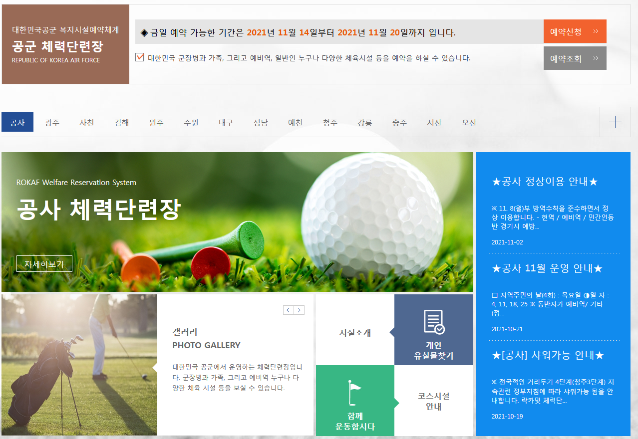 공군에서 제공하는 복지시설 예약관리체계에서는 체력단련장이 포함이 되어져 있습니다. 이곳을 이용하시면 온라인으로 이뤄진 공군체력단련장 홈페이지 바로가기를 통하여 인터넷으로 체력단련장 서비스를 편하게 이용 가능한데요.