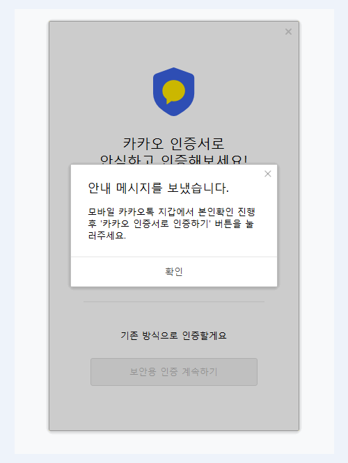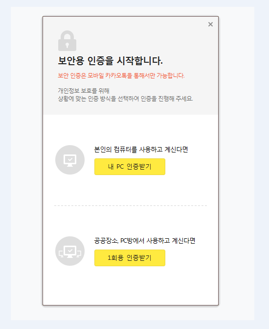 인증서는 그렇다치고 보통상의 로그인을 하실 때도 처음에는 보안 인증을 거쳐야 합니다. 이는 모바일 카카오톡을 통해서만 가능하기 때문에 우선적으로 본인 명의의 휴대전화에 카톡이 있어야 하네요. 여기에서는 내 PC나 1회용 인증으로 넘어갈 수 있습니다. 그러면 모바일 카톡으로 번호가 오게되어 이를 입력하는 방식을 활용하게 되네요.