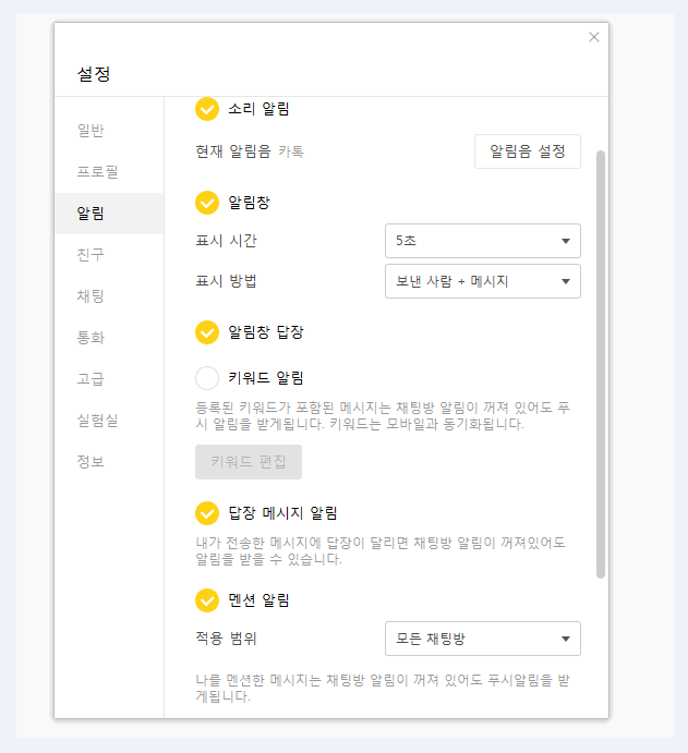 그리고 전체화면에서 영상이나 게임 등을 이용하실 때에 알림을 받는 기능이나 나와의 채팅방을 숨겨놓을 수 있는 기능들이 실험실에서 사용됩니다. 잘써먹으면 무척 편리해요.