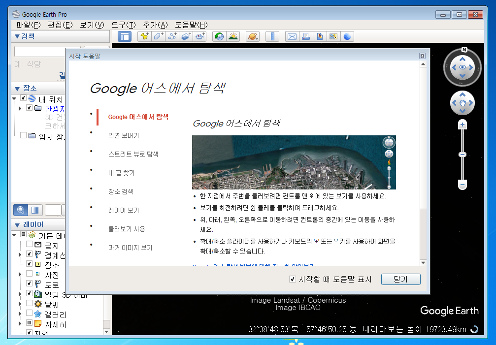처음 실행을 하실 때에는 한국어로된 시작 도움말이 창으로 나오게 되는데 잘 참고를 하시고 이용을 하면 탐색을 하는데 있어서 더 도움이 되어집니다. 그 외에 장소 검색, 레이어 보기 등도 도움말로 확인이 되어집니다.