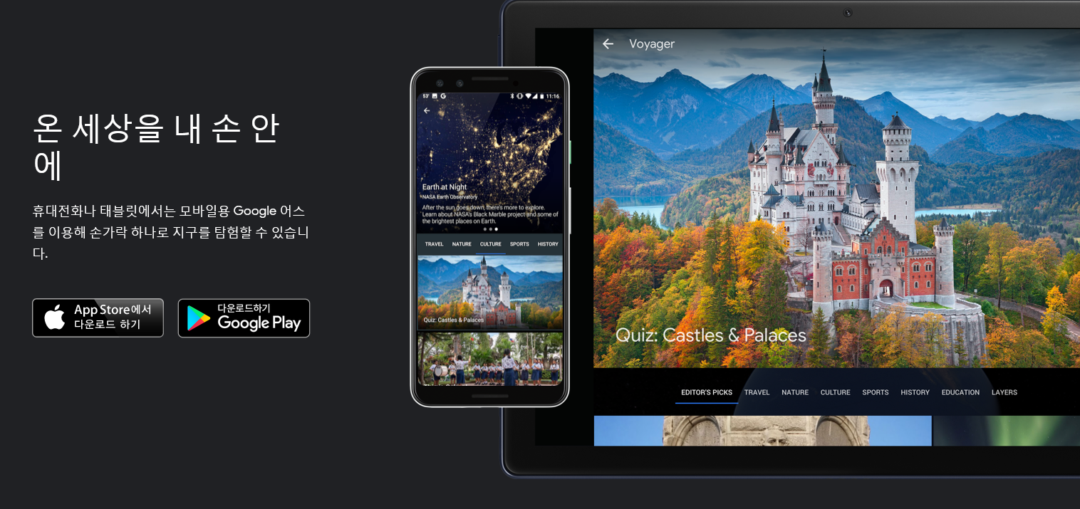 이외에도 스마트폰이나 태블릿에서도 구글어스한글판을 받을 수 있도록 스토어에서 무료다운로드를 제공하고 있는데요. 그러면 앱다운을 통하여 모바일에서도 서비스를 잘 이용 가능합니다.