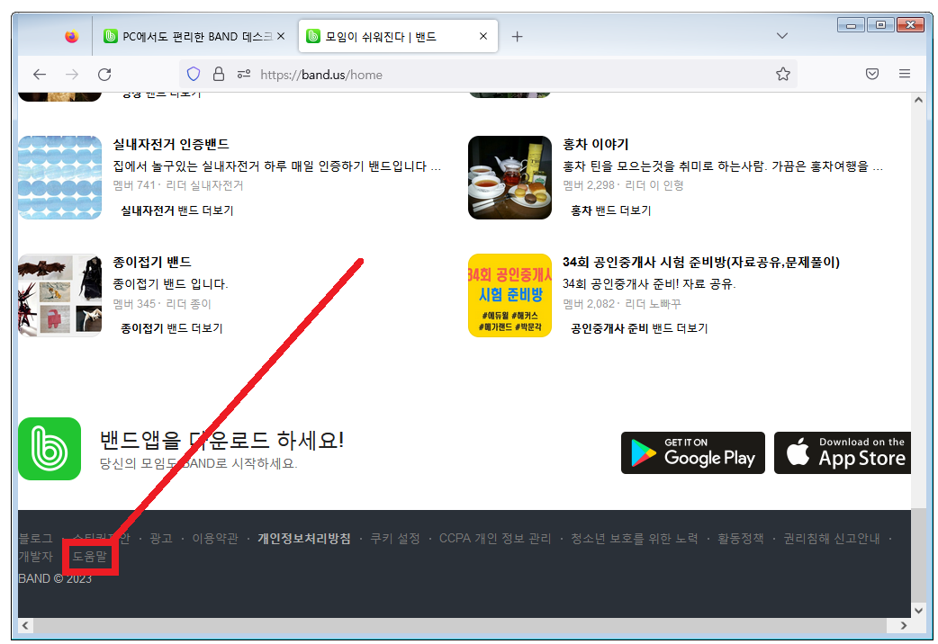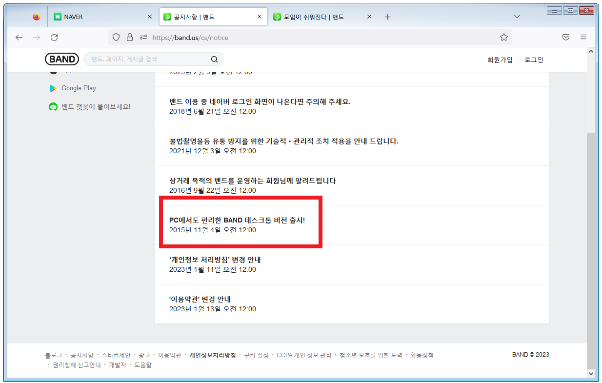 확인은 BAND 공지사항을 통하여 보시면 됩니다. 메인페이지에서는 하단의 도움말을 통하여 공지사항쪽으로 이동을 하시면 되네요.