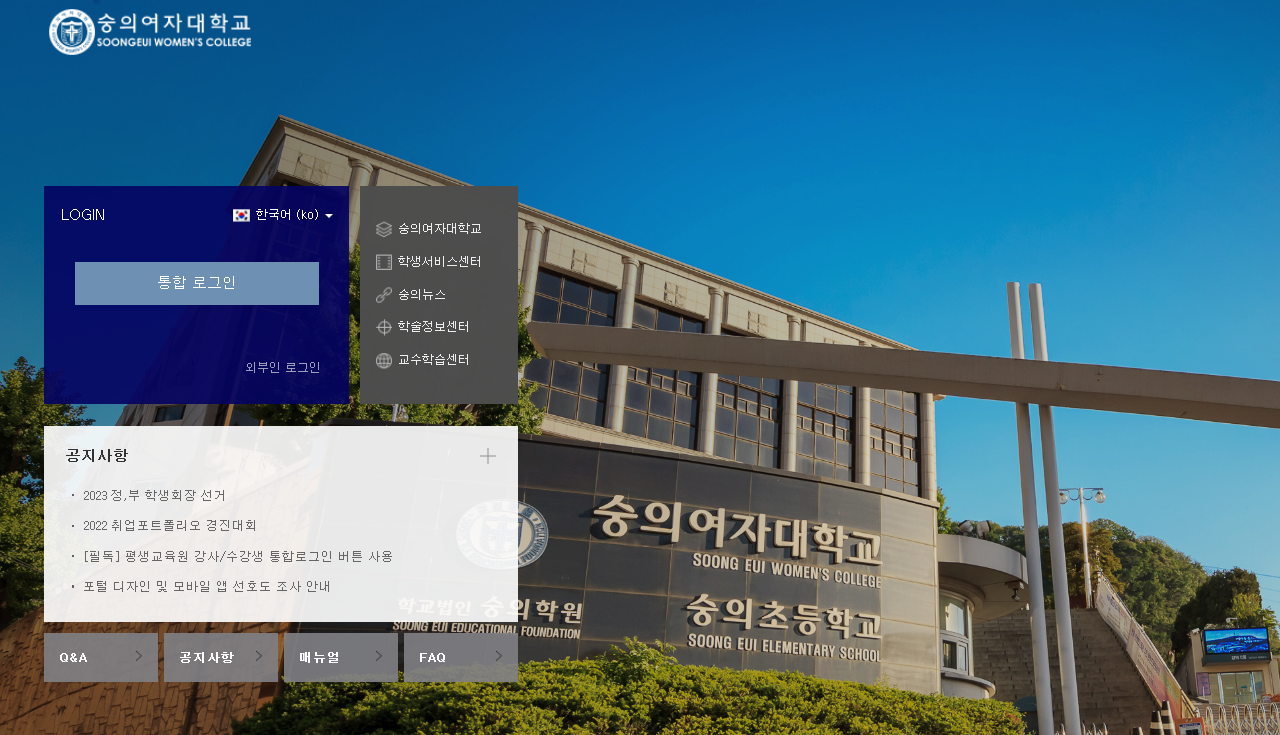숭의여자대학교에서는 학생들이 수업과 관련된 다양한 자료와 서비스를 확인하기 위하여 온라인 학습 플랫폼을 지원한다고 합니다. 해당 플랫폼은 숭의여자대학교 LMS 학습관리시스템으로써 수업자료, 강의 동영상, 성적 확인, 온라인 토론, 과제 제출 등의 다양한 기능을 제공한다고 합니다.