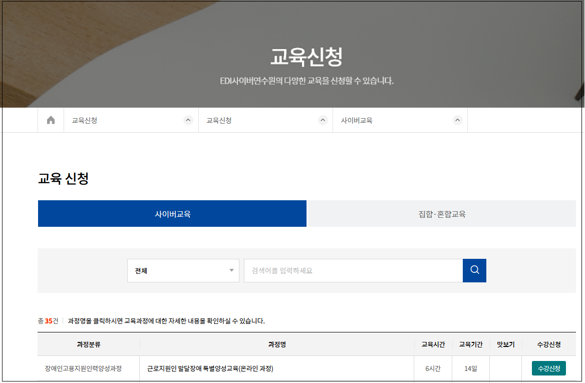모든 과정은 온라인 웹사이트에 방문하시는 자세한 정보와 교육프로그램 확인이 가능하구요. 신청도 진행이 가능합니다. 때문에 장애인 고용 분야에 관심이 있으신 분들은 EDI사이버연수원을 통하여 높은 수준의 교육과 전문 지식을 얻어보시기 바랍니다.
