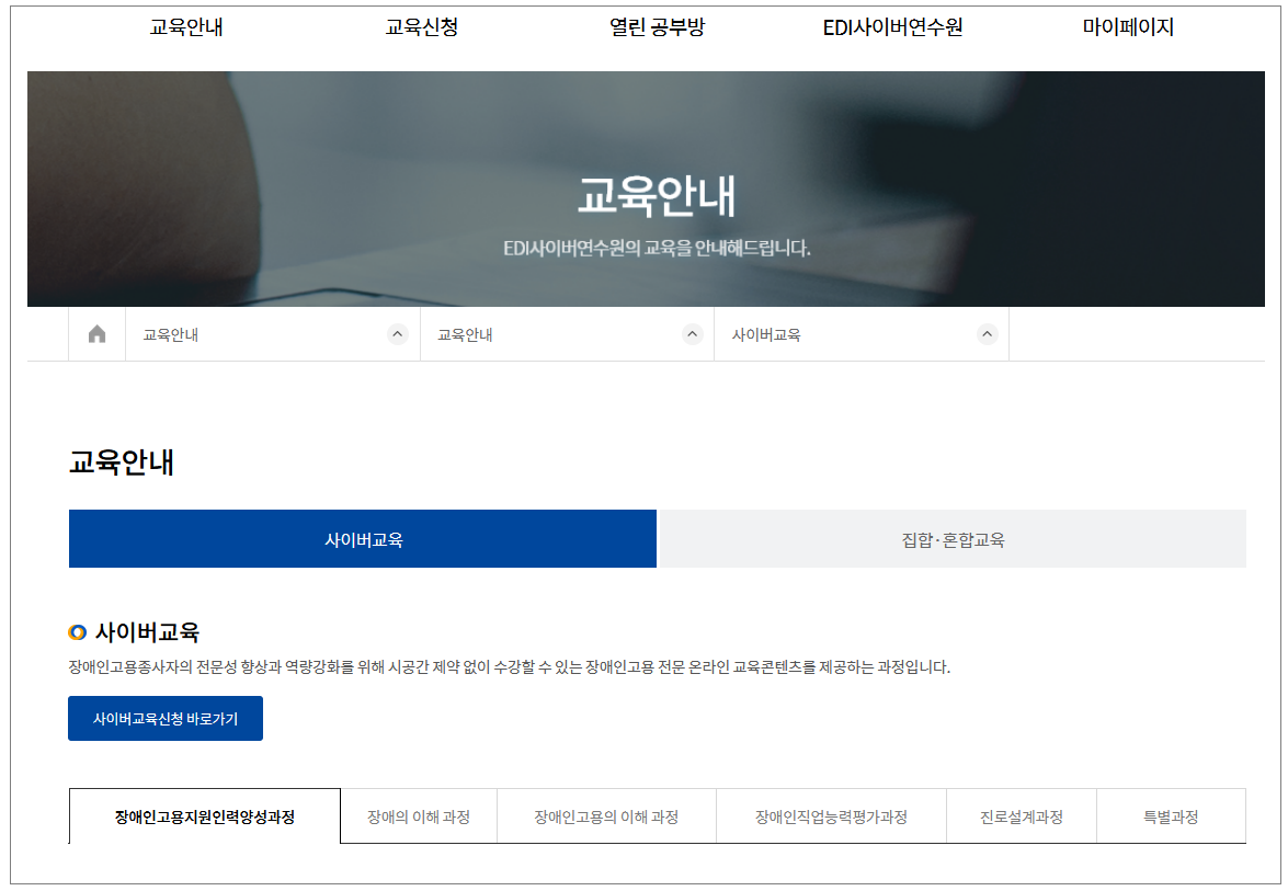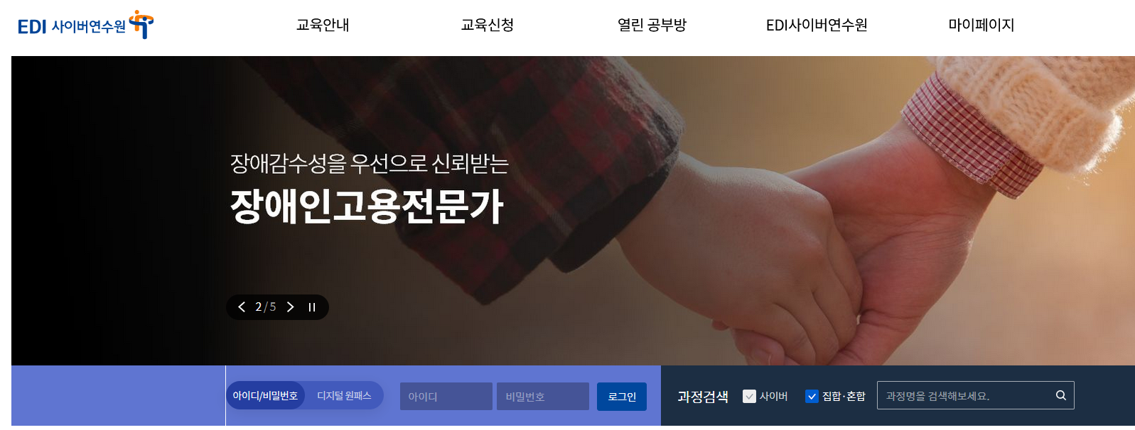 장애인 고용을 촉진하고 지원하기 위하여 한국장애인고용공단이 운영되고 있습니다. 그런가운데 EDI사이버연수원에서는 이런 장애인 고용 분야에 대한 전문적인 교육을 제공하는데요. 관련 분야의 고용의 활성화와 관련된 다양한 교육 프로그램이 운영되고 있으니 사이버연수원 잘 확인해보시기 바랍니다.