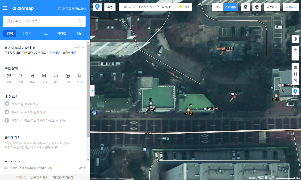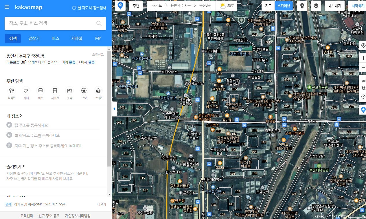 다음지도에서 항공뷰를 보는 방법은 무척이나 간단한데요. 다음지도 앱이나 웹서비스에 접속하여 '스카이뷰'를 선택하시면 바로 항공사진과 같은 뷰를 확인하실 수 있습니다.