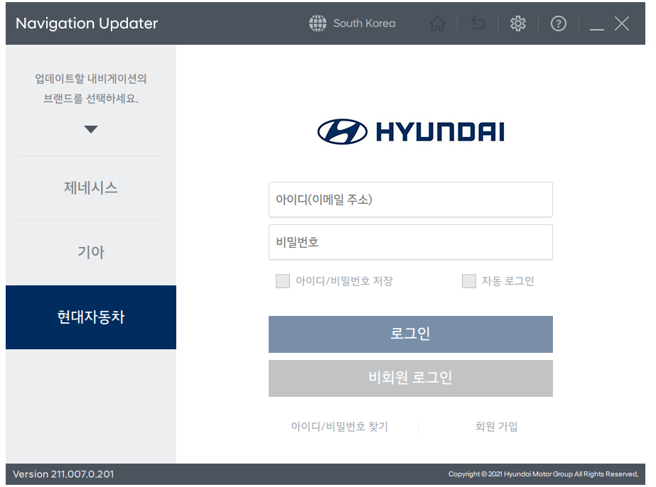 설치 완료 후에는 브랜드 선택이 되어지는데요. 제네시스, 기아, 현대자동차가 같은 계열이라서 셋 중 하나로 선택 후 접속을 하면 됩니다. 여기서는 로그인을 하지 않고 비회원으로도 들어가기가 가능합니다.